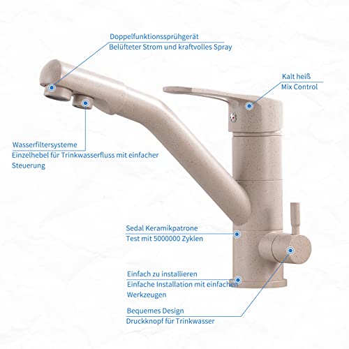 Casavilla Rubinetto 3 Vie Cucina, Miscelatore Cucina 3 Vie Girevole a 360°, Rubinetto Cucina 3 in 1 per Acqua Potabile con 2 Leve (beige)