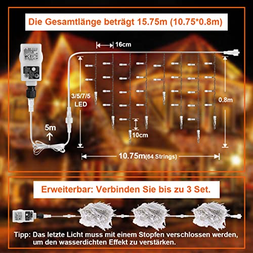 【Catena leggera all'esterno impermeabile】tenda luci: La luce della barriera fotoelettrica da 10,75 m ha 64 catene luminose e l'ultima luce di ciascun gruppo ha un ghiacciolo che forma una superficie ondulata. Può essere utilizzato per rivestire pareti e cornicioni. La catena luminosa a pioggia è impermeabile IP44 e può essere utilizzata all'interno e all'esterno, ma la spina deve essere tenuta lontana dall'acqua. (Promemoria: cavo 5 m + Cascata luci 10,75 m * 0,8 m)