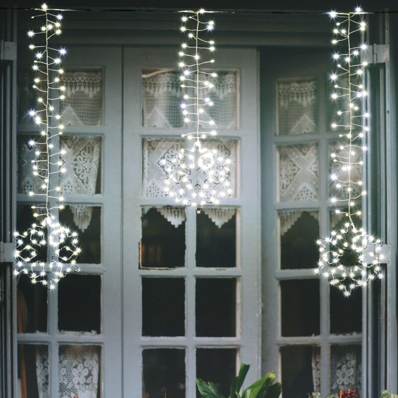 Da un cavo argento lungo 3,2 metri pendono 8 cristalli di neve a diverse altezze (alternativamente 70 e 80 centimetri). Lungo tutta la stalattite sono posizionati alcuni FlashLed a luce fredda, che emettono una luce a intermittenza. L'effetto è automatico e non si può disattivare. Le calate luminose sono festoni luminosi di micro led con cavo in metallo. I fiocchi sono costituiti da un doppio profilo in metallo, il cui perimetro è percorso da micro led bianco freddo. I cristalli di neve hanno un diametro di 18 centimetri e sono distanziati l'uno dall'altro 40 centimetri. Le calate alle estremità hanno in alto un gancio che permette di appendere la decorazione a una parete o in giardino. La decorazione può essere prolungata fino a 6,4 metri senza dover utilizzare altri accessori. Un trasformatore è integrato al cavo di alimentazione di 4 metri: riduce la tensione e ti garantisce una decorazione sicura. Dettagli 3,2 x h 0,8 m, 728 microled, cavo argento 8 cristalli di neve led Ø 5 mm