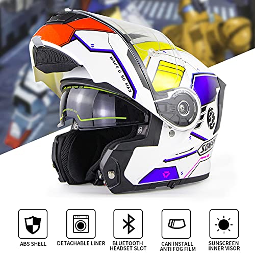 [Doppia visiera parasole]: il design dell'angolo migliorato espande la visione di guida e migliora la sicurezza del pilota. Il casco è dotato di lenti interne antiriflesso, la lente interna del casco adotta un design antiriflesso ed è progettata con un interruttore regolabile, che può essere azionato con una mano, che può essere liberamente sostituita per adattarsi ai cambiamenti di luce, evitando così tamponamenti.