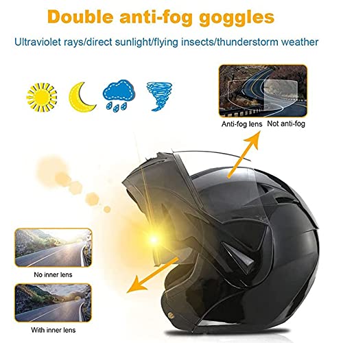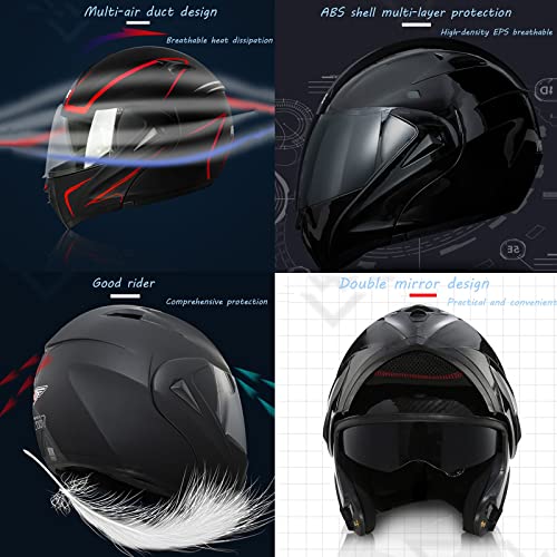 [DUAL FRONT-VIEW MIRROR SUN VISIERA E DESIGN SPORTIVO]: Casco moto anteriore ribaltabile con visiera parasole a doppio strato, antiappannamento esterno ad alta definizione, antiriflesso interno, tutte le alette parasole sono sostituibili e hanno un rivestimento antigraffio, "Anti-Haze" è fornito in condizioni meteorologiche estreme come la bassa temperatura e la stagione delle piogge e può rispondere rapidamente alla forte luce solare.
