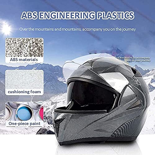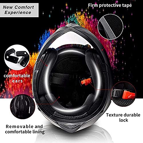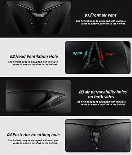 SISTEMA DI VENTILAZIONE: visiera parasole completamente regolabile e dispositivo di ventilazione del viso, design aerodinamico dello scafo, fori di scarico posteriori possono massimizzare il flusso d'aria, la migliore circolazione dell'aria, può portare una guida piacevole, visione chiara, testa confortevole, inverno caldo e estate fresca.