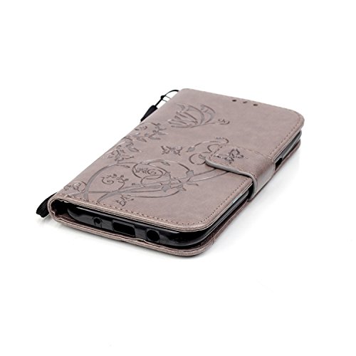 CaseHome Custodia in pelle per iPhone SE/5S/5 (con protezione schermo), motivo: fiore/farfalla in rilievo, custodia a libro con chiusura magnetica, antiurto, resistente, funzione di supporto, angoli rinforzati in gomma, protezioni interne, custodia protettiva di qualità in ecopelle (PU) per Apple SE/5S/5 con scomparti per carte di credito e cordoncino, colore: grigio Couleur Grise Samsung Galaxy J5 2015/J500FN
