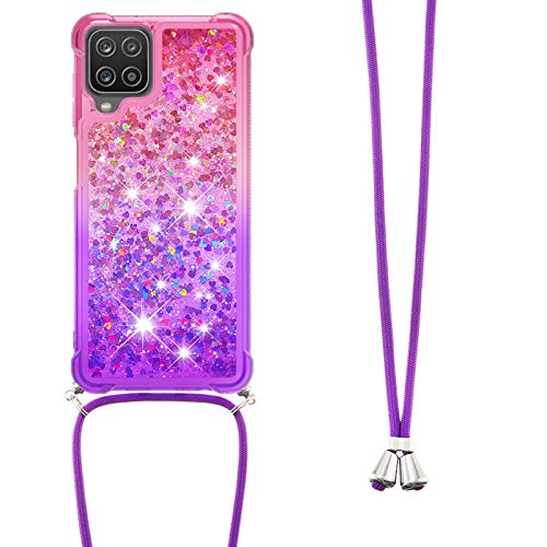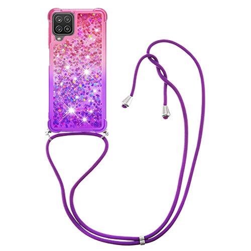 CaseLover Custodia con Collana per Samsung Galaxy A12 5G, Glitter Liquido Sabbie Mobili Sequin Trasparente Morbido TPU Silicone Cover con Necklace Cordino Protettiva Case per A12 5G, Rosa Viola