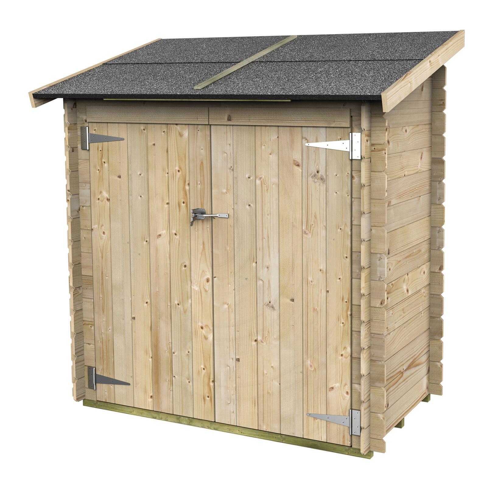 Casetta BH 16 mm in abete grezzo dim. 155x85cm. Porta doppia cieca con chiavistello, pavimento e tetto in OSB sp.12mm. Guaina bituminosa per copertura inclusa. Ferramenta e istruzioni di montaggio. Prodotto corrierabile. ricovero attrezzi. Armatura di rinforzo pareti in abete naturale. consegnabile con corriere - sponda idraulica. Listelli di fondazione impregnati in autoclave