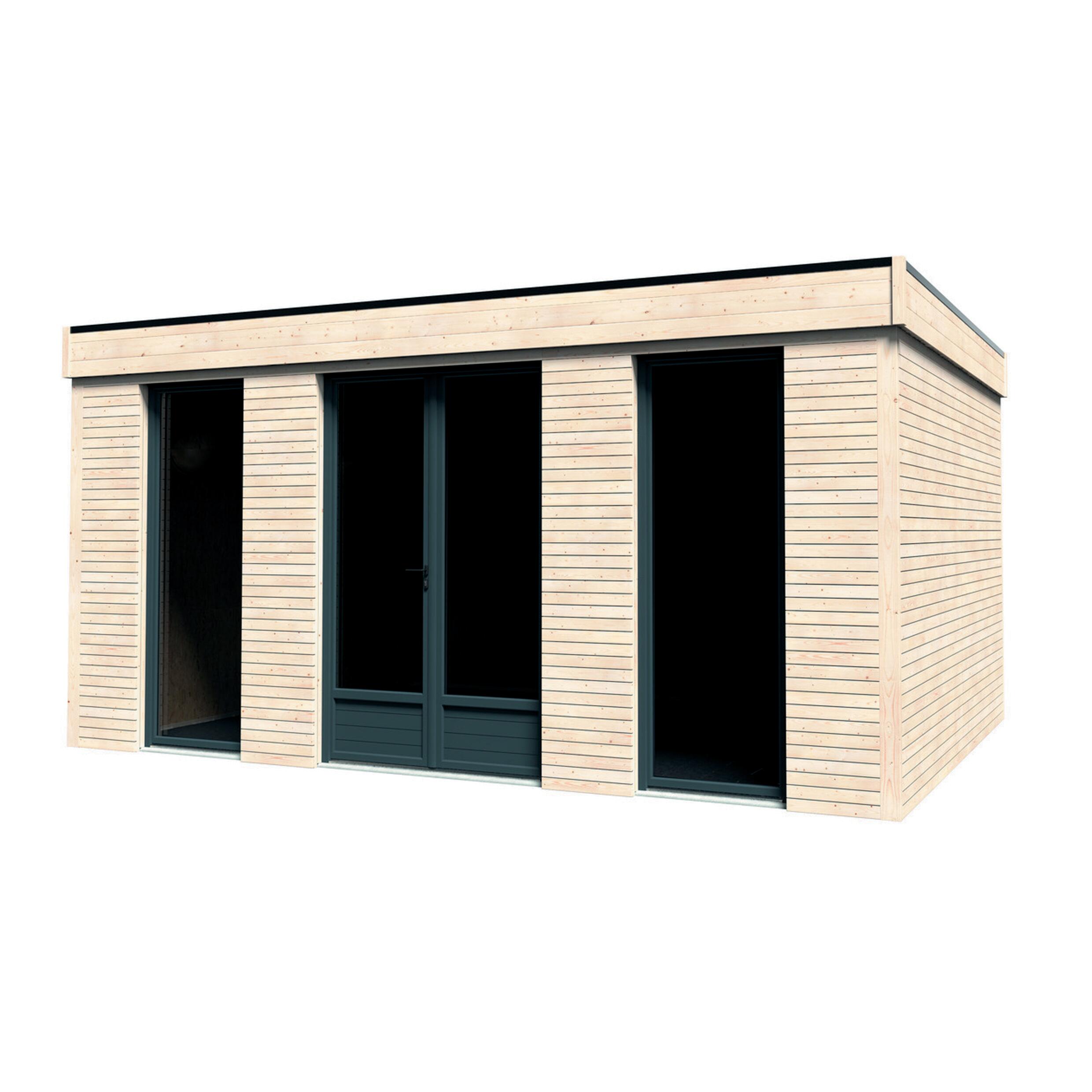 Modulo semi abitativo Decor Home In legno grezzo di abete del nord, L 497 x P 365 cm, struttura a pannelli, altezza colmo 250 cm. Ideale per creare uno spazio hobby, una stanza giochi per i figli o una zona relax immersa nel verde. Materiale robusto e naturale, è decorabile e personalizzabile. La struttura a pannelli è semplice e veloce da montare. Il lucernario e le porte a vetri favoriscono il passaggio della luce garantendo un ambiente luminoso, ideale per il ricovero delle piante nel periodo invernale