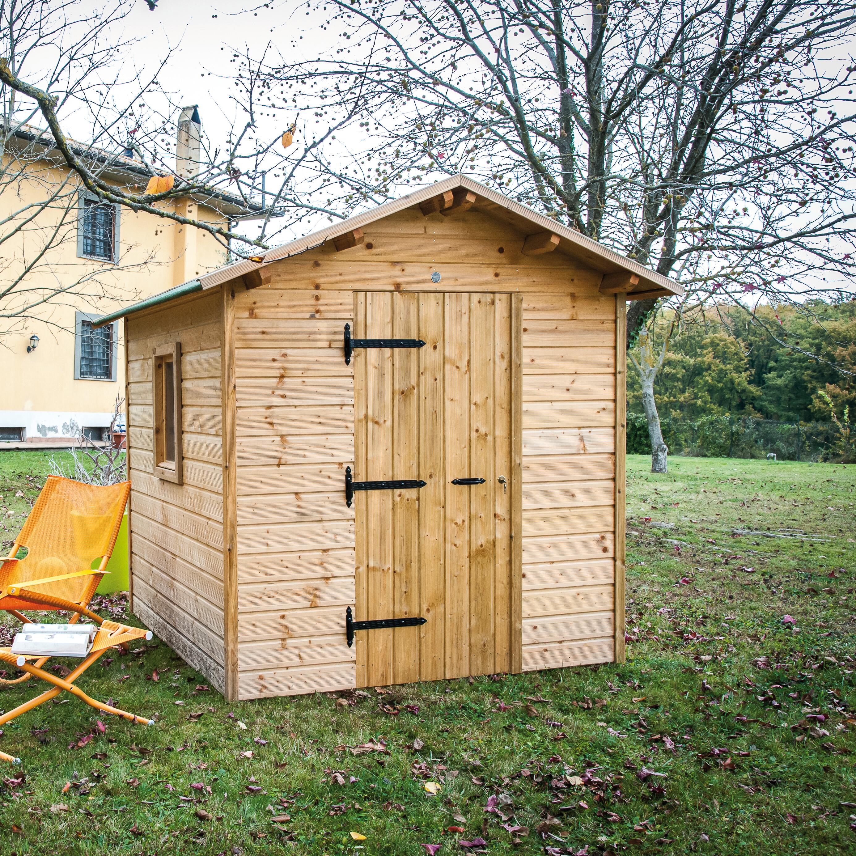 Struttura a pannelli in legno di abete impregnato in autoclave. Dimensioni: L 240 x P 254 cm, altezza colmo 235 cm. Ideale da utilizzare come ricovero per macchine da giardino, mobili e barbecue. Materiale molto robusto e con un'ottima resistenza;