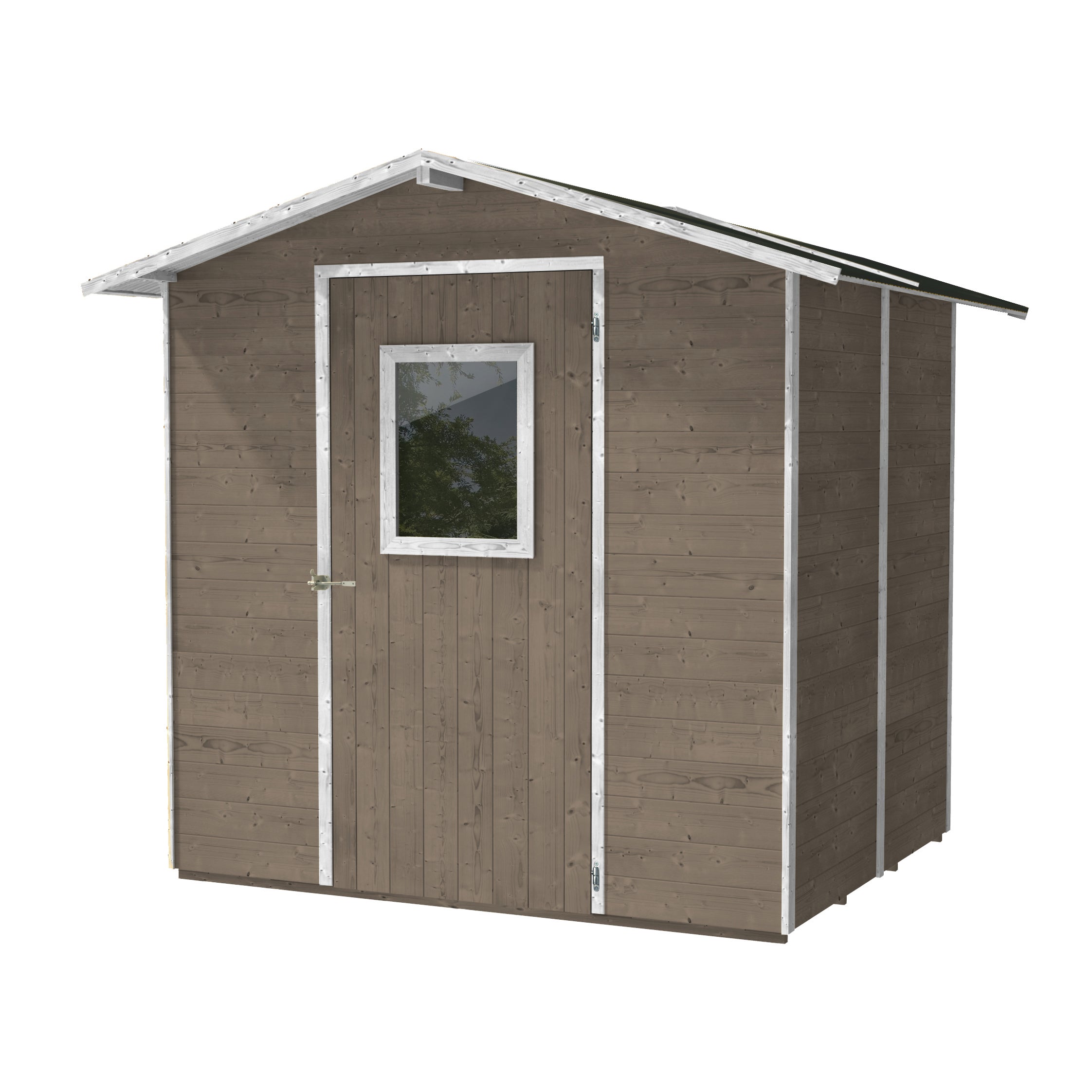 In legno di abete verniciato con Flowsystem, tortora, L 200 x P 245 cm, struttura a pannelli, altezza colmo 214 cm. Ideali da utilizzare come ricovero per macchine da giardino, mobili e barbecue. La struttura a pannelli è semplice e veloce da montare. Pavimento incluso per un maggiore isolamento e comfort