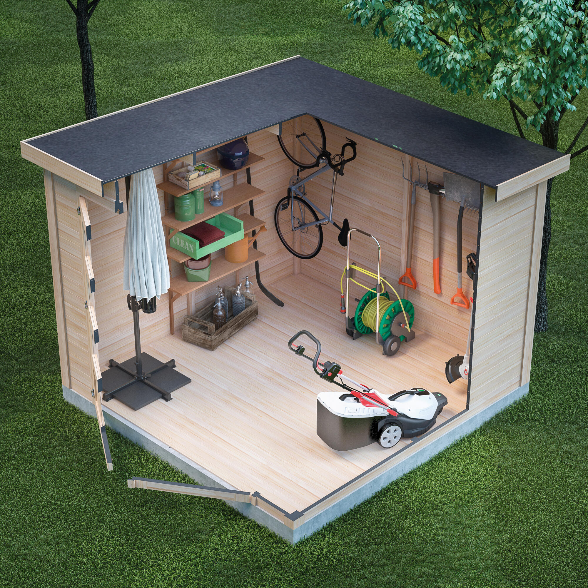In legno grezzo di abete del nord, L 270 x P 275 cm, struttura Blockhouse e viti, altezza colmo 202,6 cm. Ideale per realizzare una stanza in più da utilizzare tutto l'anno. Materiale robusto e naturale, è decorabile e personalizzabile. Ampia apertura. La doppia porta permette il ricovero anche di attrezzi di grandi dimensioni e mobili da giardino