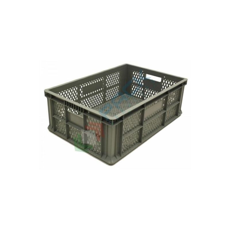 CASSETTE SOVRAPPONIBILI NORMA EUROPA FORATE, PER ALIMENTI Contenitore in plastica sovrapponibile Norma Europa, capacità 38 Lt, con misura esterna: 600 L x 400 P x 190 H mm e misura interna: 569 L x 366 P x 175 H mm. La cassetta presenta base, pareti forate e maniglie passanti. Contenitore realizzato in PP (Polipropilene). Colore grigio chiaro. Scatola in plastica idonea al contatto con alimenti. Le cassette formato EURO sono distinguibili da altezza, misura della base, dimensioni esterne ed interne. E' possibile scegliere tra modelli con maniglie passanti che ne agevolano la presa e la movimentazione e sono indicate per il trasporto di carichi pesanti;