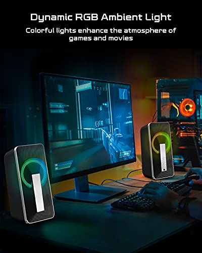 ♪ 【Design elegante e unico】: l'altoparlante PC SR300 non è solo innovativo dal punto di vista tecnico, ma anche innovativo nel design.Abbiamo scelto materiale ABS di alta qualità, che promette una lunga durata e protezione dall'usura. I LED luci colorate aiutano a diventare più alla moda,migliora l'atmosfera di guardare film e giocare.