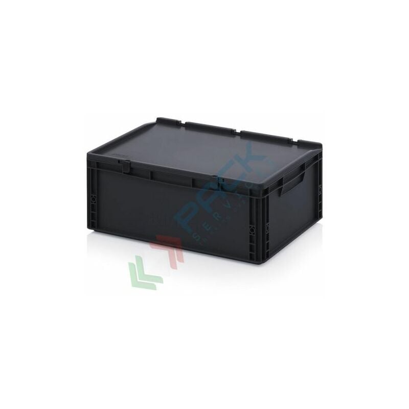 CASSETTA IN PLASTICA ANTISTATICA E CONDUTTIVA Contenitore in plastica, conduttivo e antistatico, capacità 45 Lt, Mis. esterne 600 L x 400 P x 235 H mm, Mis. interne 570 L x 370 P x 215 H mm. Cassetta in plastica sovrapponibile, norma Europa, con coperchio integrato. La cassa in plastica, il coper CASSETTA IN PLASTICA ANTISTATICA E CONDUTTIVA Contenitore in plastica, conduttivo e antistatico, capacità 45 Lt, Mis. esterne 600 L x 400 P x 235 H mm, Mis. interne 570 L x 370 P x 215 H mm. Cassetta in plastica sovrapponibile, norma Europa, con coperchio integrato. La cassa in plastica, il coperione al contenuto. Base e pareti chiuse, maniglie chiuse. Cassetta conduttiva e antistatica in polipropilene (PP), NON idonea al contatto alimentare. Con l'utilizzo di contenitori antistatici si evitano cariche elettrostatiche;