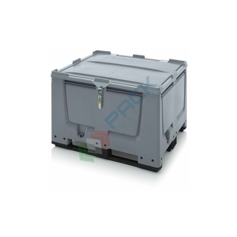 Bins in plastica (HPDE) con sistema di chiusura SA/SV, Mis. esterna: 1200 L x 1000 P x 790 H mm, Mis. interna: 1110 L x 910 P x 610 H mm. Contenitore industriale realizzato con 3 traverse piedi, volume 670 Lt, peso 52,5 Kg. Grazie a due cerniere di fissaggio (SA) e ad una chiusura a scatto (SV), garantisce massima sicurezza. Cassa pallet non adatta per i liquidi, ma idonea al contatto alimentare. Cassone in plastica con coperchio robusto e particolarmente sicuro;