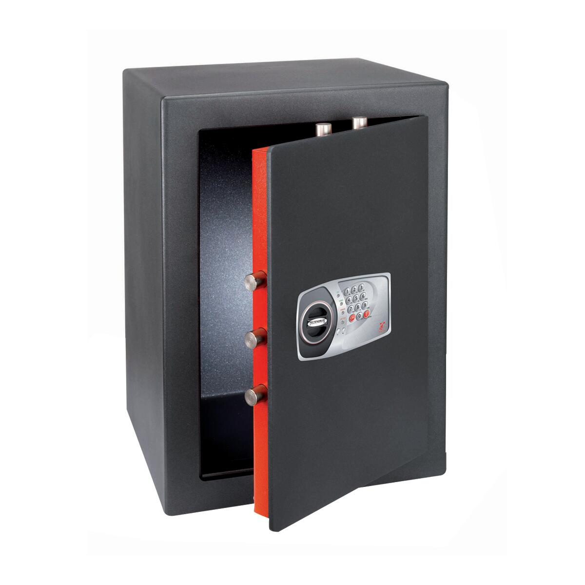 Cassaforte a muro, 7 chiavistelli Ø 22 mm. Adatta per proteggere attrezzi di valore come macchine fotografiche e videocamere. La serratura a combinazione elettronica è di facile e pratico utilizzo senza la necessità di custodire le chiavi. I catenacci girevoli impediscono alle lame di fare presa e quindi di essere tagliati. Sportello di elevato spessore per garantire un'alta protezione contro lo sfondamento