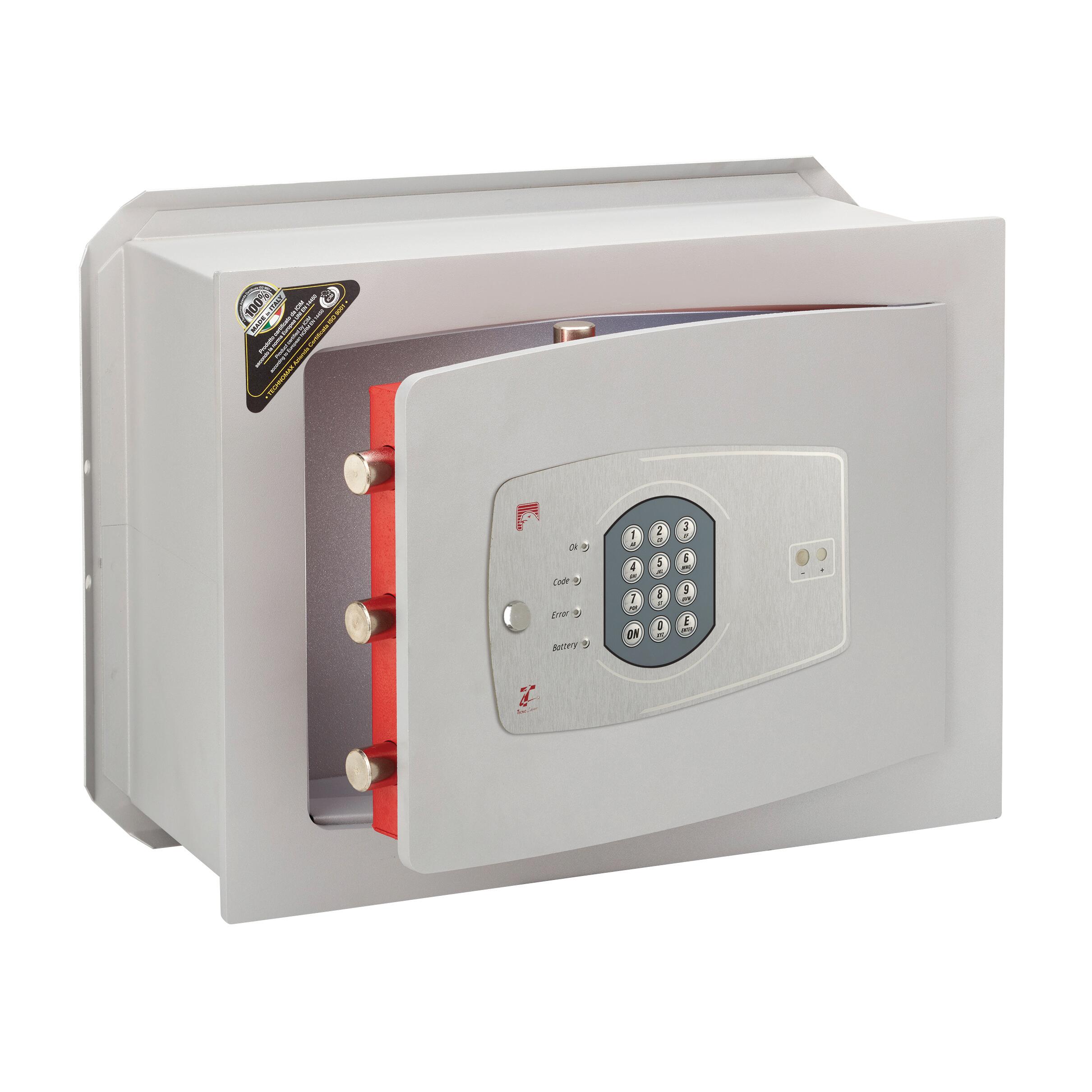 Cassaforte a muro, 5 chiavistelli Ø 22 mm girevoli. Adatta per proteggere attrezzi di valore come macchine fotografiche e videocamere. La serratura a combinazione elettronica è di facile e pratico utilizzo senza la necessità di custodire le chiavi. I catenacci girevoli impediscono alle lame di fare presa e quindi di essere tagliati. Sportello di elevato spessore per garantire un'alta protezione contro lo sfondamento