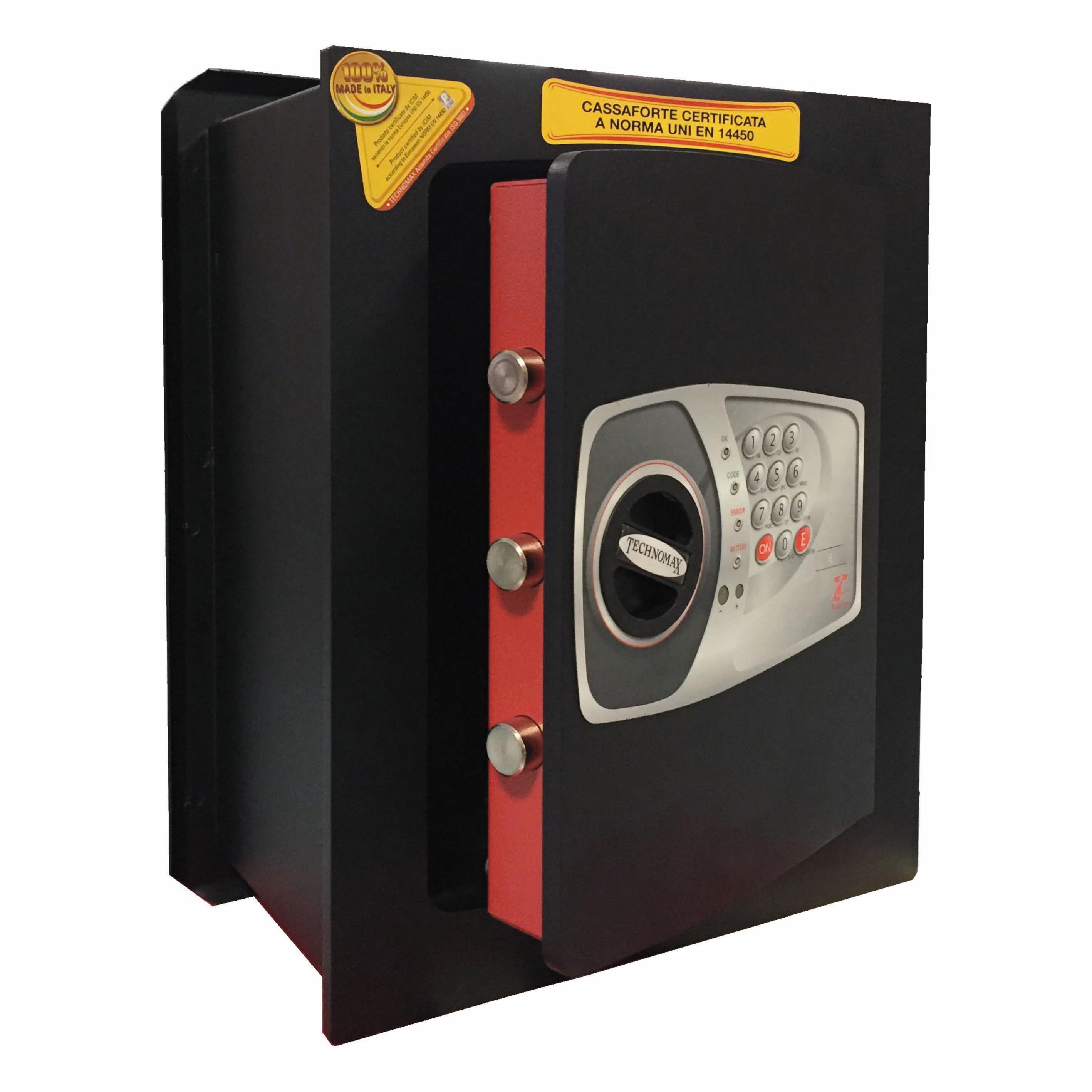 Cassaforte a muro, 5 chiavistelli Ø 22 mm girevoli. Adatta per contenere importanti documenti in formato A4. La serratura a combinazione elettronica è di facile e pratico utilizzo senza la necessità di custodire le chiavi. I catenacci girevoli impediscono alle lame di fare presa e quindi di essere tagliati. Sportello di elevato spessore per garantire un'alta protezione contro lo sfondamento