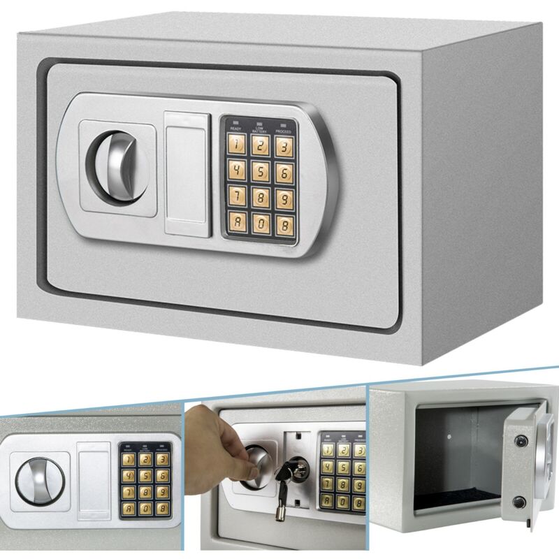 Tutti i vantaggi in sintesi: Serratura elettronica a combinazione. Codice di sicurezza programmabile individualmente (Combinazione di 6 cifre). Costruzione in acciaio. Apertura di emergenza realizzabile con le due chiavi incluse. Supporta il montaggio sia a parete che su armadi. Chiusura di alta qualità: due chiavistelli in acciaio (chiusura a doppio catenaccio). Fori predisposti per il montaggio a parete o su pavimento. Porta di 3,2 mm di spessore. AREBOS - Cassaforte elettronica a mobile, cassaforte a muro Ideale per conservare e proteggere: la nostra cassaforte AREBOS è dotata di una porta in acciaio di 3,2 mm di spessore ed è perfetta per uso privato o per uffici. Puoi sia conservare che proteggere oggetti di valore. La cassaforte a mobile è realizzata in solido acciaio e può essere montata sia a parete che su pavimento. Codice individuale La cassaforte è dotata di serratura elettronica e può essere programmata individualmente e utilizzata facilmente. Puoi definire e, se