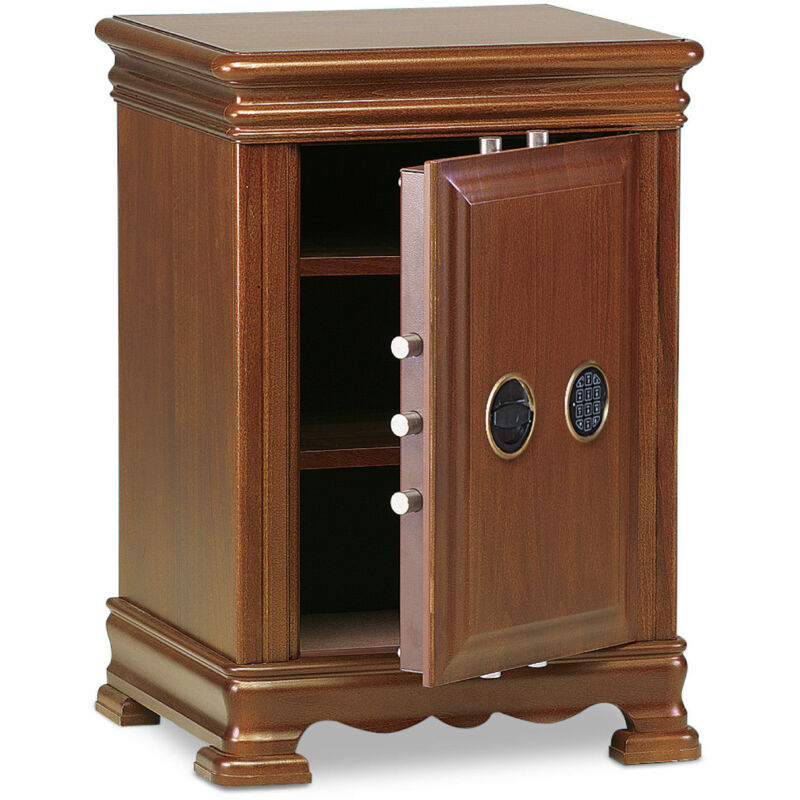 La linea Evolution si inserisce in qualunque contesto di arredamento, grazie al calore del legno che coniuga lbeleganza con la sicurezza dei prodotti Technomax. CARATTERISTICHE TECNICHE - La cassaforte presenta una serratura (certificata UNI EN 1300) di ultima generazione, quindi di alta sicurezza con 8 leve asimmetriche ed indipendenti. La sua eccezionale resistenza agli attacchi con gli ultimi sistemi di manipolazione con speciali grimaldelli (l'attrezzo bulgaro, ad esempio) è( dato dallbutilizzo di nuove leve antipicking oscillanti e mentonnet a profilo speciale. Per ostacolare eventuali duplicazioni di chiavi non autorizzate, il prodotto presenta una chiave a doppia mappa con profilo speciale, duplicabile esclusivamente con carta d'identità . - Estrazione della chiave impossibile a catenacci rientrati. - 7 catenacci girevoli in acciaio nichelato à 22 mm. - Piastra in acciaio al manganese a protezione del meccanismo della serratura e dei catenacci orizzontali e verticali superiori.