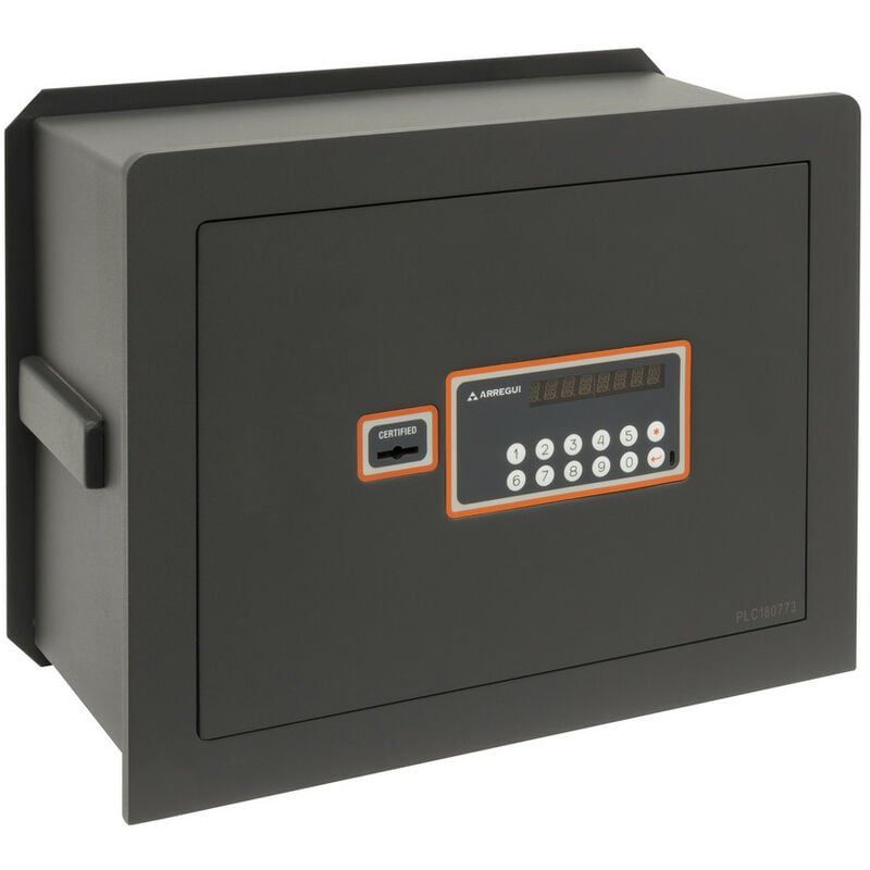 Caratteristiche fisiche: Realizzata in acciaio con taglio laser. Frontale con protezione antitrapano 10+3 mm: frontale di 10 mm di spessore più una piastra speciale antitrapano di 3 mm. Spessore corpo: 2 mm Chiusura con catenacci di acciaio nichelato di 22 mm di diametro. Catenacci ANTI SEGHETTO girevoli per impedire i tentativi di taglio con seghetto dall'esterno. Con chiusura ANTI LEVA. I catenacci, quando la porta è chiusa, sono alloggiati in una piastra di protezione extra che impedisce i tentativi di forzare la porta con una leva. La profondità è regolabile, in modo da poter essere incassata all'interno di muri di qualsiasi spessore, con 5 profondità diverse, comprese tra i 200 e i 300 mm (200/225/250/275/300 mm). Con comoda luce interna a LED a risparmio energetico che si accende e si spegne quando la cassaforte viene aperta e chiusa. Con ripiano interno, rimovibile nel caso in cui si preferisca non usarlo. Modelli disponibili (misure: altezza x larghezza x profondità): ->