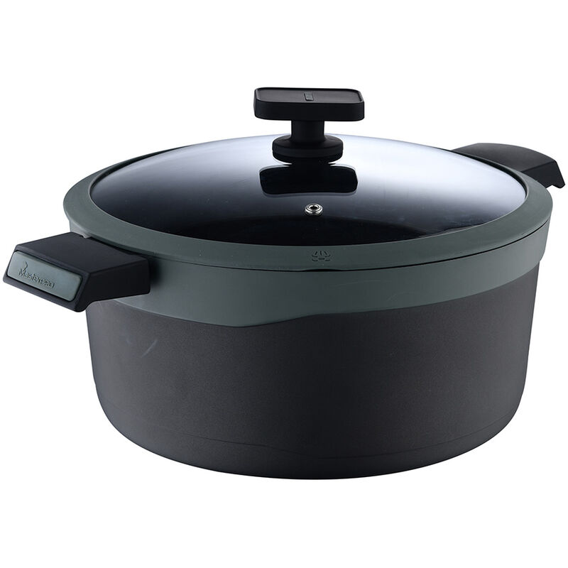 Pentola in alluminio fuso 28x13,5 cm con coperchio gastro reeco bgmp-8108 masterpro. pentola realizzata in acciaio inox, che garantisce una grande durata al pezzo. con una capacità di 3,8 litri, questa pentola ha una scala di misurazione interna, oltre a due beccucci su entrambi i lati per versare correttamente il liquido. adatta a tutte le fonti di calore, compresi i piani a induzione, questa padella è stata progettata per far risparmiare tempo durante la cottura grazie a un disco diffusore di qualità per una distribuzione impeccabile del calore. il suo manico ergonomico con rivestimento in silicone nero offre molta più sicurezza e comfort durante l'utilizzo della padella. inoltre, grazie al suo coperchio in vetro, è possibile accelerare ulteriormente il processo di cottura e risparmiare ancora più tempo.