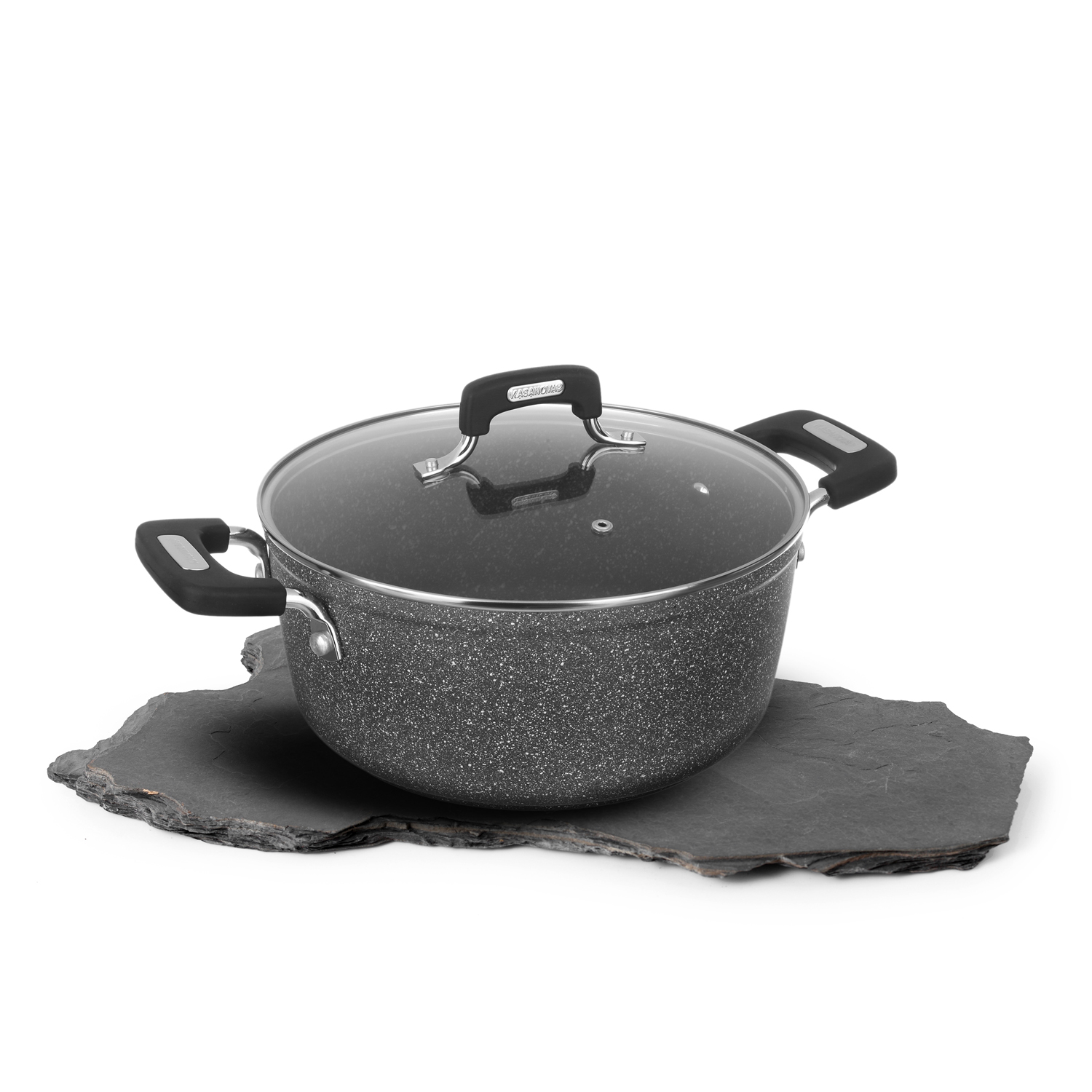 New Petra Dark è la linea cottura perfetta per il piano a induzione utilizzabile anche in forno fino a 180 °C, senza coperchio. Il nome è ispirato ai colori e alla durezza dei materiali che la compongono esaltandone il design accattivante e l'estrema resistenza. Grazie al rivestimento antiaderente 5 strati Greblon a base d'acqua, è ideale per cotture senza grassi aggiunti e rispettose dell'ambiente. Il fondo in acciaio full induction completamente piatto aderisce perfettamente al piano cottura e rende la casseruola perfetta per l'induzione e adatta anche agli altri piani. Con manici rivestiti in silicone e coperchio in vetro. Priva di PFOA e nichel nel rivestimento, ma può contenerne in minima parte nel manico. Lavabile in lavastoviglie, ma per preservare l'antiaderenza si suggerisce il lavaggio a mano.