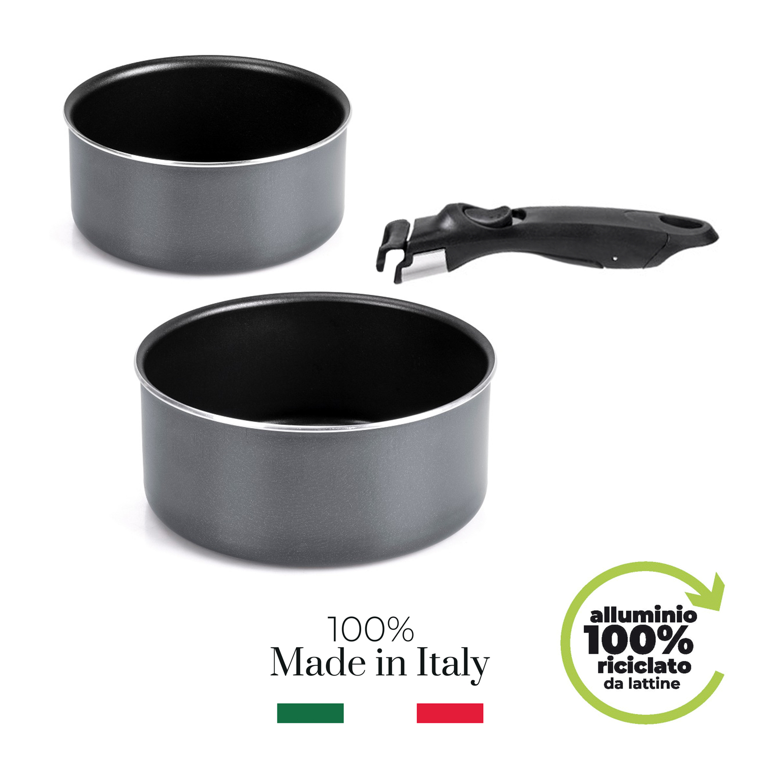 Manico staccabile salvaspazio: impugnatura in bachelite con design italiano e finitura soft touch per una presa salda e sicura. Si stacca dal corpo della pentola per poter impilare il set e riporlo occupando minimo ingombro in cucina;