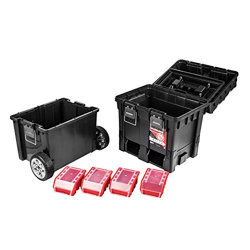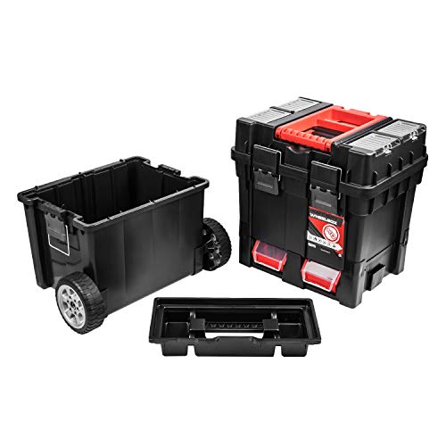 Caratteristiche: grandi ruote con diametro di 145 mm consentono una guida facile. Grande manico stabile per spostarlo facilmente. 4 chiusure in metallo garantiscono una presa sicura e una lunga durata. Un ripiano estraibile nel modulo superiore serve per riporre piccoli utensili. 4 scatole rimovibili con coperchio trasparente e porta etichette consentono di riporre piccoli oggetti.