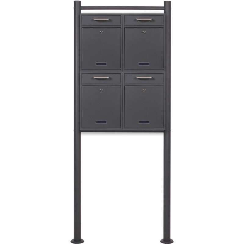 Spaziose cassette delle lettere color antracite dall'aspetto discreto e moderno Disposizione 2x2 con stand di supporto, materiale per il montaggio a pavimento incluso Ampia fessura per l'inserimento della posta e sportellino impermeabile antifurto con manico Cassette con serratura, 2 chiavi, targhetta del nome e protezione anti caduta Resistente alle intemperie, in lamiera galvanizzata e verniciata a polvere e acciaio inossidabile 304 Queste cassette delle lettere con pali di supporto dal design semplice ed elegante color antracite sono adatte sia all'interno che all'esterno e offrono molto spazio per lettere, riviste e oggetti più grandi. Le cassette sono realizzate in lamiera d'acciaio galvanizzata. La superficie verniciata a polvere le rende durevoli e resistenti agli agenti atmosferici. Ogni cassetta presenta un'ampia fessura in modo che anche riviste e giornali possano essere inseriti senza essere piegati. Il pratico sportello protegge la posta dall'acqua. Inoltre, può essere