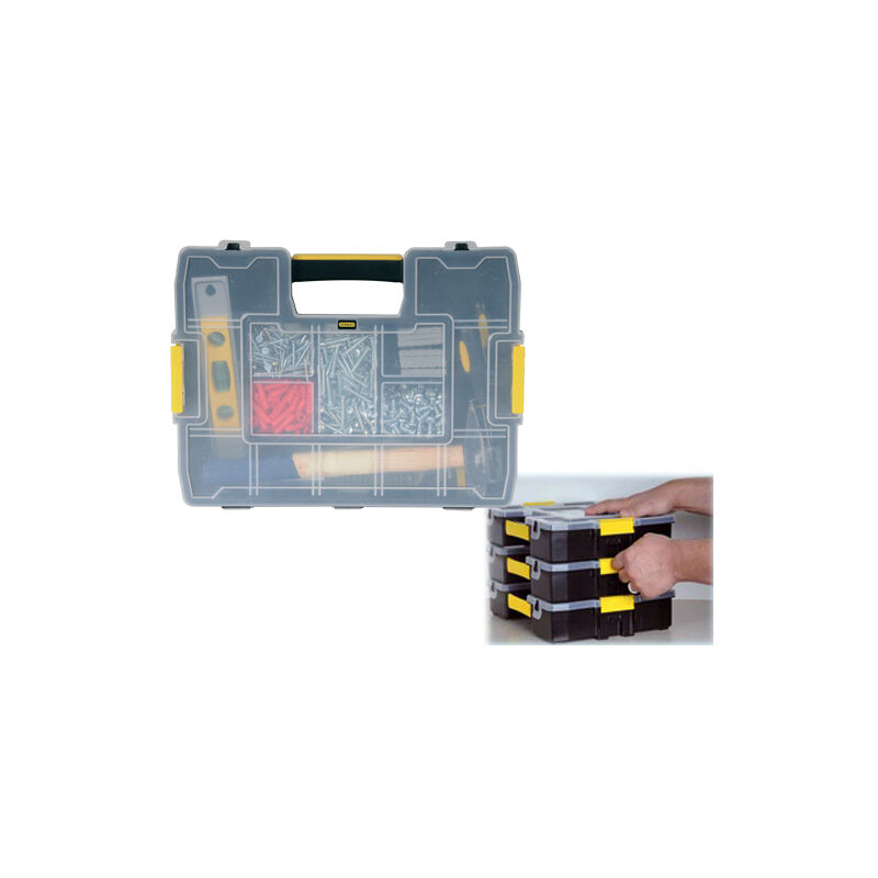 Coperchio trasparente con scanalatura ad incastro dei divisori centrali nessun rischio di mischiare il contenuto, divisori removibili, pulsante di bloccaggio nel coperchio, permette l'alloggiamento di martelli o altri utensili con forme ad angolo di 90°
