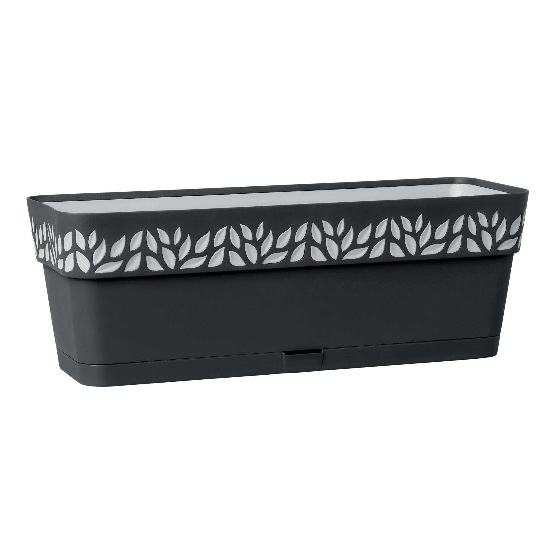 Balconetta linea Opera in plastica color grafite, decoro Cloe e dimensioni 50 x 18 x h 17 cm. Ideale per rendere ogni angolo della casa uno spazio chic ed originale. Balconetta caratterizzata da un contrasto cromatico che disegna dettagli delicati e romantici. Prodotta in Italia, il materiale con cui è realizzata è al 100% riciclabile. Dotata di riserva d'acqua per una corretta irrigazione di fiori e piante