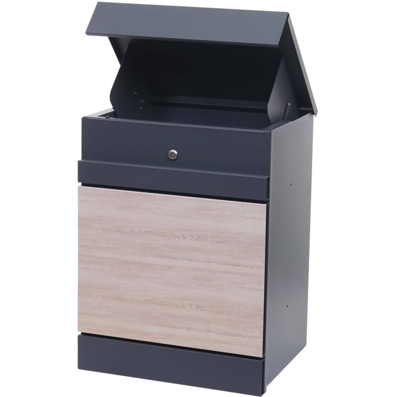 Cassetta postale portalettere pacchi modello HHG-121 acciaio zincato verniciato a polvere 58x45x36cm colore ANTRACITE E LEGNO Le cassette postali non dovrebbero servire solo al loro scopo, ma essere anche un'aggiunta decorativa alla tua area esterna. Con questo modello ottieni entrambi: una cassetta portalettere funzionale e moderna. Questa cassetta è realizzata in acciaio zincato verniciato a polvere e ha un vano a portata di mano per pacchi e libri, in modo che vengano conservati al riparo fino a quando non verranno portati in casa. La cassetta ha anche un sistema ben congegnato per conservare i pacchi in totale sicurezza: lo sportello drop-in viene aperto e il pacco viene inserito all'interno. Non appena lo sportello si chiude, il pacco cade nella zona inferiore della cassetta dei pacchi, dove può essere prelevato solo aprendo lo sportello frontale. La cassetta postale a muro può essere montata rapidamente e facilmente. Il materiale di montaggio è incluso così le chiavi della