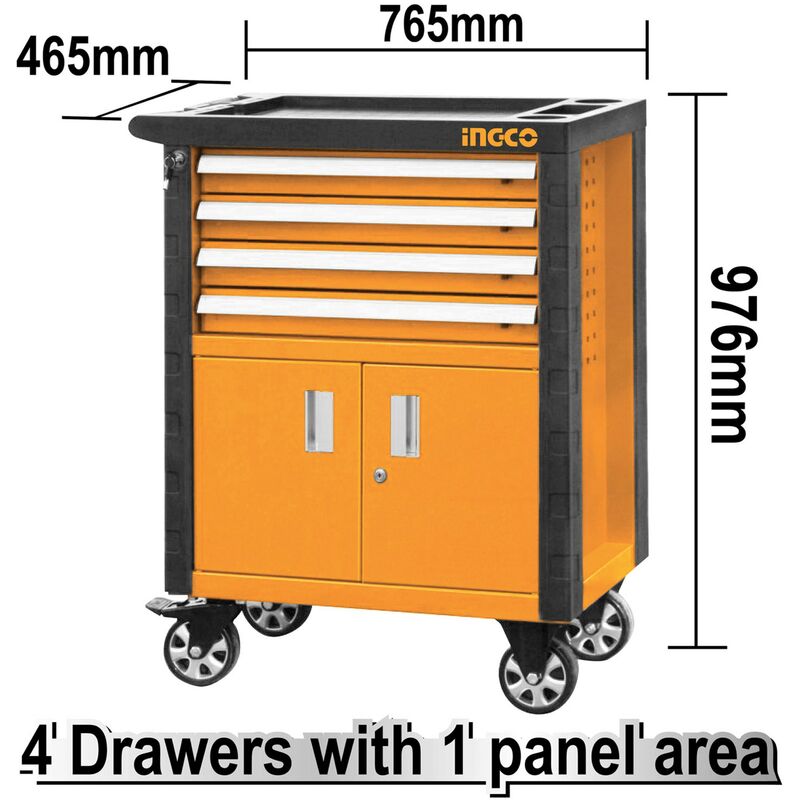 CARRELLO PORTATTREZZI PREMIUM VUOTO "INGCO" Carrello portattrezzi vuoto, con 4 cassetti e vano chiuso con ante. Dimensioni complessive: mm. 765x465x812h Dimensioni complessive con ruote: mm. 765x465x976h Spessore lamiera 0,8/1,0 mm Spessore dei cassetti 0,7 mm Dimensione cassetti: 536x410x74,5 mm Cassetti con cuscinetti a sfera Area del pannello 560x420x395 con chiusura centralizzata Protezione antifurto