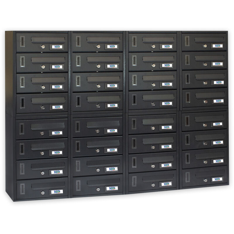 CARATTERISTICHE CASSETTA POSTALE CONDOMINIALE 32 POSTI CM 120X17X84H - MODELLO MODULAR - La sofisticata cassetta condominiale, dall'elegante finitura nero antracite, incarna il perfetto equilibrio tra funzionalità e stile contemporaneo. La sua struttura modulare, composta da 8 moduli da 4, si presenta come un'espressione di design raffinato, consentendo una disposizione flessibile e armoniosa nel contesto condominiale. La cassetta condominiale da 32 posti modulare, con dimensioni di 120x17x84h cm, è accompagnata da un set di 32 coppie di chiavi numerate (una coppia per singola cassetta) esemplificando un livello superiore di sicurezza e accessibilità personalizzata per ogni inquilino. Il colore nero antracite aggiunge una nota di sobria eleganza, perfettamente adattandosi all'ambiente circostante. L'inclusione dei Kit (Targhette Portanome e Portachiavi) conferisce un tocco distintivo e altamente funzionale a ogni cassetta condominiale. La sezione interna della cassetta è attentamente