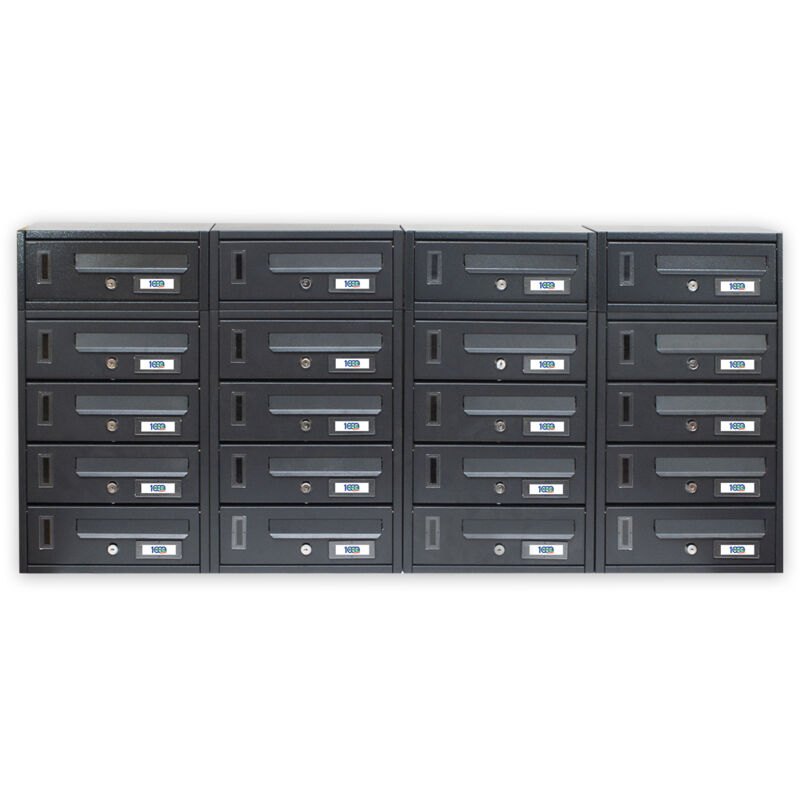 La sofisticata cassetta condominiale, dall'elegante finitura nero antracite, incarna il perfetto equilibrio tra funzionalità e stile contemporaneo. La sua struttura modulare, composta da quattro moduli da 4 e quattro moduli da 1, si presenta come un'espressione di design raffinato, consentendo una disposizione flessibile e armoniosa nel contesto condominiale. La cassetta condominiale da 20 posti modulare, con dimensioni di 120x17x54h, è accompagnata da un set di 20 coppie di chiavi numerate (una coppia per singola cassetta) esemplificando un livello superiore di sicurezza e accessibilità personalizzata per ogni inquilino. Il colore nero antracite aggiunge una nota di sobria eleganza, perfettamente adattandosi all'ambiente circostante. L'inclusione dei due kit (Targhette portanome e Portachiavi in omaggio) conferisce un tocco distintivo e altamente funzionale a ogni cassetta condominiale. La sezione interna della cassetta è attentamente progettata per proteggere la posta da intemperie
