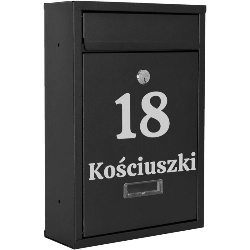 Cassetta postale nera Gustav per lettere con iscrizioni Colore: nero Pratica cassetta postale in acciaio zincato, verniciata a polvere. Uno stile moderno e senza tempo che non può essere ignorato. Oltre alle sue funzioni di base, la scatola sarà gradevole alla vista e farà invidia ai tuoi vicini! Realizzato con materiali di alta qualità e resistenti agli agenti atmosferici, grazie ai quali tutta la corrispondenza è molto ben protetta. Prodotto personalizzato Possibilità di realizzare qualsiasi iscrizione: numero civico, ragione sociale, cognome, via, ecc. L'iscrizione è realizzata utilizzando la pellicola per plotter Oracal, resistente agli agenti atmosferici. La lamina è di colore argento Caratteristiche del prodotto Acciaio zincato Resistenza alle condizioni atmosferiche Finestre per i dati dell'indirizzo Installazione all'interno e all'esterno Fori di ventilazione con serratura Dimensioni del prodotto Altezza: 32 cm Profondità: 8,5 cm Larghezza: 21,5 cm Finestra di identificazione