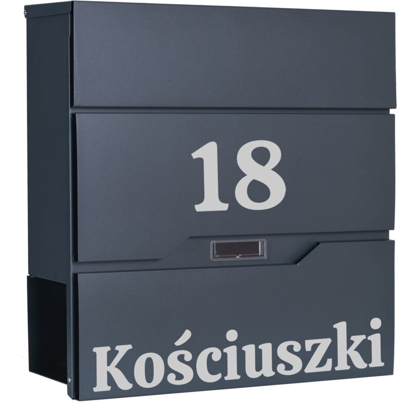 Cassetta postale Vidar antracite con iscrizioni Colore: nero Pratica cassetta postale in acciaio zincato e verniciato a polvere. Uno stile moderno e senza tempo che non può essere ignorato. Oltre alle sue funzioni di base, la scatola sarà gradevole alla vista e farà invidia ai tuoi vicini! Realizzato con materiali di alta qualità e resistenti agli agenti atmosferici, grazie ai quali tutta la corrispondenza è molto ben protetta. Prodotto personalizzato Possibilità di realizzare qualsiasi iscrizione: numero civico, ragione sociale, cognome, via, ecc. L'iscrizione è realizzata utilizzando la pellicola per plotter Oracal, resistente agli agenti atmosferici. La lamina è di colore argento Caratteristiche del prodotto Finestra per indirizzi 6 x 2 cm Distanza tra i fori di montaggio 23 x 17 cm Dimensioni apertura lettere: 33 x 3,5 cm Acciaio zincato verniciato a polvere Resistenza agli agenti atmosferici Installazione all'interno e all'esterno Bloccabile 2 set inclusi chiavi e un kit di