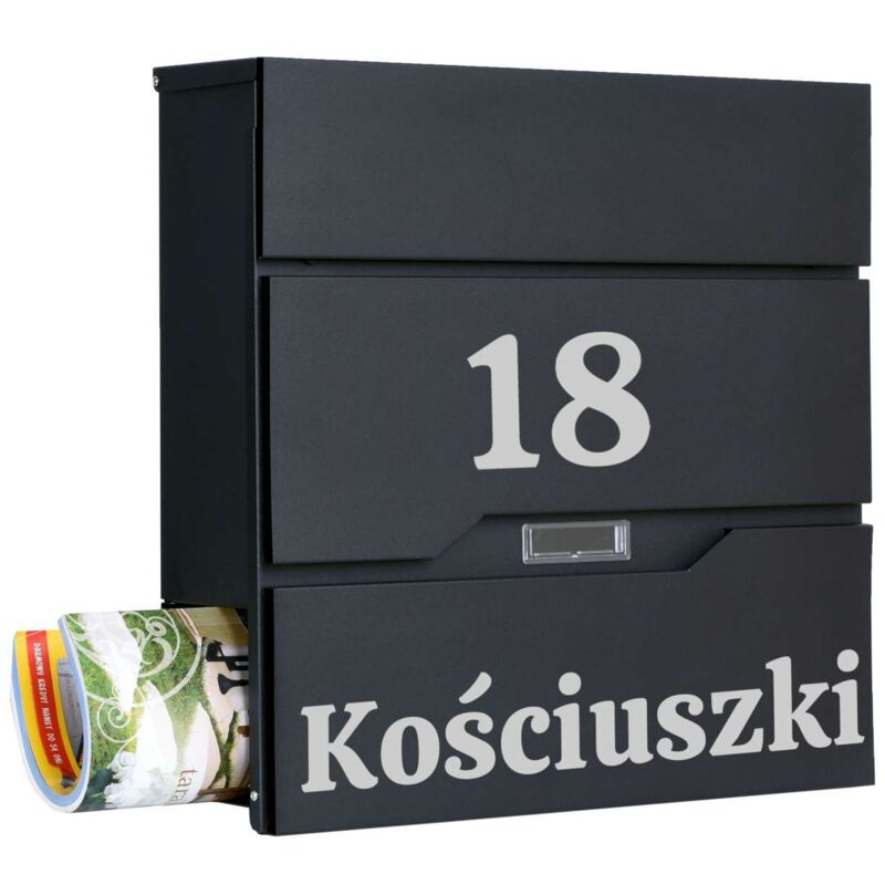 Cassetta postale nera Vidar con iscrizioni Colore: nero Pratica cassetta postale in acciaio zincato, verniciata a polvere. Uno stile moderno e senza tempo che non può essere ignorato. Oltre alle sue funzioni di base, la scatola sarà gradevole alla vista e farà invidia ai tuoi vicini! Realizzato con materiali di alta qualità e resistenti agli agenti atmosferici, grazie ai quali tutta la corrispondenza è molto ben protetta. Prodotto personalizzato Possibilità di realizzare qualsiasi iscrizione: numero civico, ragione sociale, cognome, via, ecc. L'iscrizione è realizzata utilizzando la pellicola per plotter Oracal, resistente agli agenti atmosferici. La pellicola è di colore argento. Caratteristiche del prodotto: Finestra per indirizzo: 6 x 2 cm. Distanza dei fori di montaggio: 23 x 17 cm. Dimensioni dell'apertura per le lettere: 33 x 3,5 cm. Resistente agli agenti atmosferici installazione esterna Con serratura, 2 set di chiavi inclusi e un kit di montaggio Spazio per giornali e