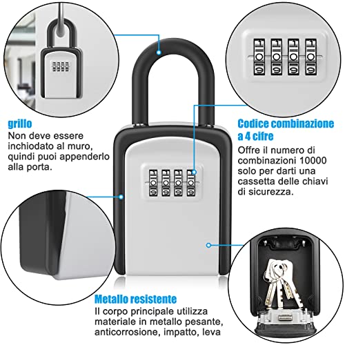 ✔【Sicura e Facile da Usare-Combinazione a 4 Cifre】Lucchetto a combinazione a 4 cifre, fornisce 10000 combinazioni di codici per una sicurezza ottimale, utile anche per condividere con altri l'utilizzo delle chiavi. Senza essere presenti, puoi semplicemente dare alla persona autorizzata solo un codice di 4 cifre. Scatola portaoggetti sicura portatile, occupa meno spazio ed è più comodo da usare. Può essere fissata alla parete per casa, ufficio, garage, scuola, magazzino, noleggio (Airbnb).