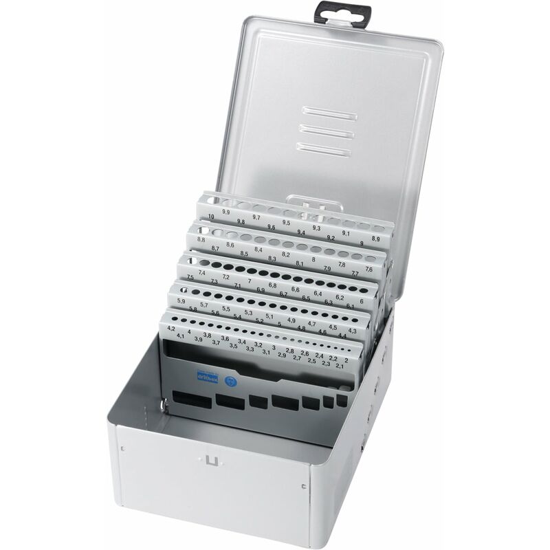 DescrizioneEsecuzione:Da corredare con gli assortimenti di ricambio, adatte per punte elicoidali DIN 338.Dati tecnici Per punte 2 mm - 10 mm Per punte a misure crescenti di 0,1 mm Tipo di prodotto Cassetta vuota Codice articolo 115475 2-10 EAN / GTIN 4045197891600