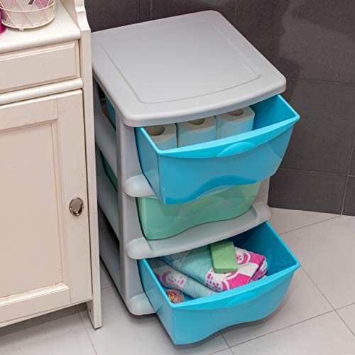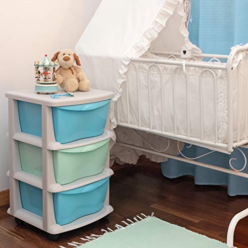 Cassetti di stoccaggio in plastica su ruote pesanti Mobiletto robusto nero per contenitori in 3 cassetti Blu e Verde - Fatto in Europa