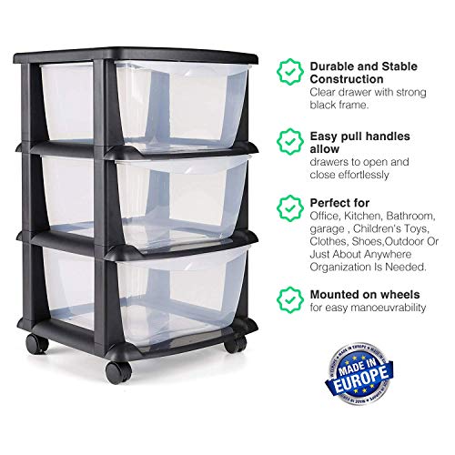 Cassetti di stoccaggio in plastica su ruote pesanti Mobiletto robusto nero per contenitori in 3 cassetti - Fatto in Europa