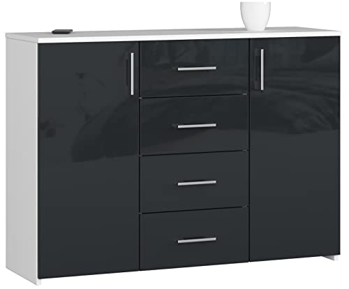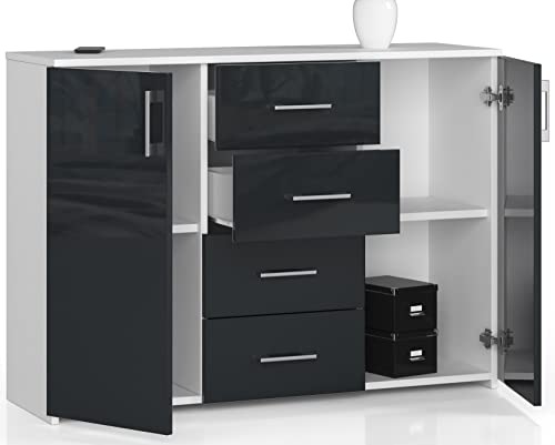 ADGO K45 - Cassettiera con 4 cassetti e 2 armadi, 110 x 80 x 35 cm, stile classico con mensole per camera da letto, cameretta dei bambini, autoportante (spedizione in 2 confezioni) (grafite lucida)