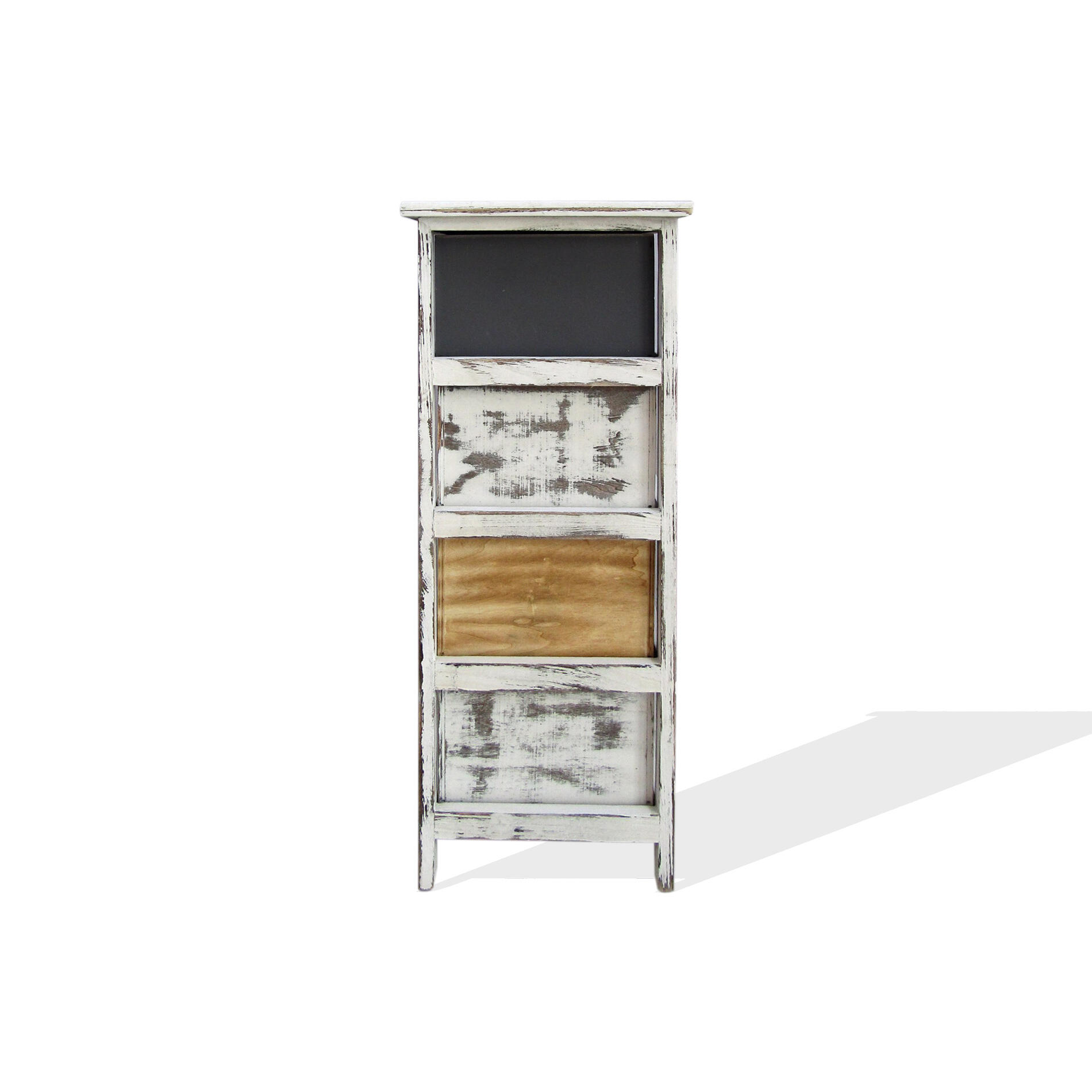 • La cassettiera è ideale per chi ha bisogno di una cassettiera piccola. Le sue dimensioni ti permettono di utilizzarla come cassettiera salvaspazio in stanze piccole. E' utile anche come comodino da letto 4 cassetti. La forma alta e stretta ti permette di collocarla accanto alla testata del letto. E' caratterizzata da uno stilo shabby e raffinato. La struttura dipinta con la con la tecnica del decapè lascia intravedere le venature naturali del legno. I cassetti dipinti con la stessa tecnica si alternano nei toni del grigio, bianco e marrone creando un gioco cromatico semplice ed elegante. E' adatta come cassettiera shabby da camera o mobiletto da ingresso vintage. Inoltre la cassettiera è già completamente montata. Non dovrai far altro che aprire la confezione e collocarla dove preferisci. • Dimensioni: H 74 cm x L 28 cm x P 28 cm - Dimensioni cassetti: H 15 cm x L 21,5 cm x P 23 cm • Colore: Bianco, Marrone, Grigio shabby • Montaggio: Il mobile arriverà già montato e pronto all'uso • Materiale: Legno di Paulownia. Adatto per bagno, camera da letto, soggiorno. Adatto per riporre piccoli oggetti. Già montato e pronto all'uso. Le sue forme contenute lo rendono perfetto per arredare anche stanze di piccole dimensioni