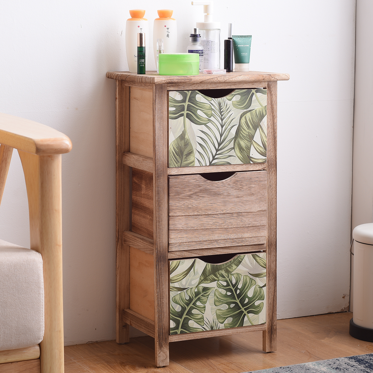 Comodino Natural 3 Cassetti Legno Marrone Verde 65x34x27. Dimensioni: H 72 cm x L 40 cm x P 29 cm - Dimensioni Cassetti (4): H 14 cm x L 33 cm x P 24 cm. Il comodino Natural puoi utilizzarlo a seconda delle tue esigenze. E' adatto come cassettiera da ingresso per tenere a portata di mano chiavi, portafogli ed occhiali. In bagno è utile come mobiletto organizer per riordinare elastici, fermacapelli e trucchi. Come cassettiera da cameretta puoi sfruttarlo per poggiare un abat jour e contenere matite e piccoli quaderni. Ha una struttura in legno naturale, semplice e lineare che incornicia i cassetti esaltando la naturalezza del legno e riducendo al minimo i trattamenti chimici. Il cassetto inferiore è come la struttura, con una finitura che esalta le venature calde del legno. Il cassetto superiore è caratterizzato da un motivo stile tropicale, dalle tonalità del verde. Puoi abbinarlo ad un soggiorno country o ad una camera stile rustico