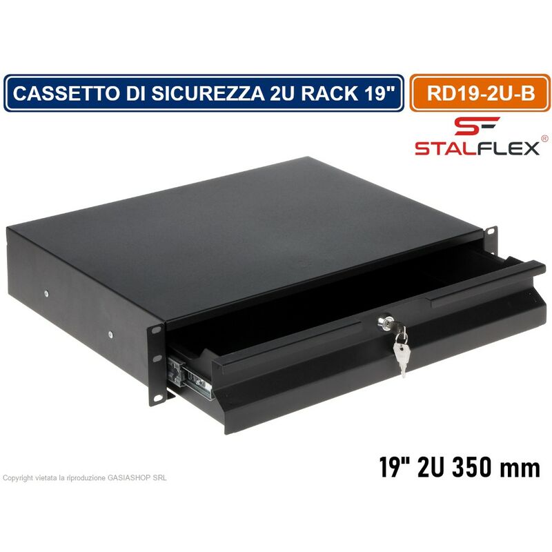 Cassetto RACK 19" 2U Consigliato per STALFLEX 19" Rack Caninet con un minimo profondità 350 mm. Ideale per conservare documenti o attrezzature importanti, protetto da un lucchetto (2 chiavi incluse). L'acciaio di alta qualità verniciato a polvere di cui sono realizzati i cassetti garantisce la robustezza e la stabilità della struttura. Guide in metallo La comodità e la leggerezza d'uso è assicurata da guide metalliche che permettono lo stacco del cassetto. Pressacavo rompibile Il cassetto ha un passacavo frangibile posto sul retro. È una soluzione molto pratica per trasportare il cablaggio dai dispositivi al rovescio. Installazione facile! Cassetto fissato alle guide verticali della cremagliera con sei punti. Kit di montaggio GRATIS! Il set fornisce quattro viti M6 con cestelli e rondelle.