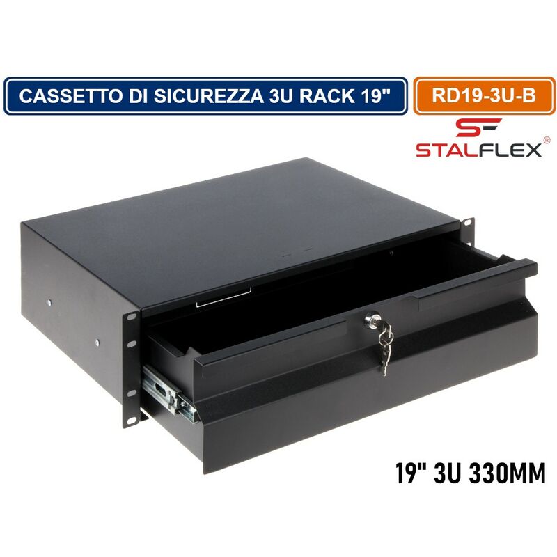 Cassetto RACK 19" 3U Consigliato per STALFLEX 19" Rack Caninet con un minimo profondità 350 mm. Ideale per conservare documenti o attrezzature importanti, protetto da un lucchetto (2 chiavi incluse). L'acciaio di alta qualità verniciato a polvere di cui sono realizzati i cassetti garantisce la robustezza e la stabilità della struttura. Guide in metallo La comodità e la leggerezza d'uso è assicurata da guide metalliche che permettono lo stacco del cassetto. Pressacavo rompibile Il cassetto ha un passacavo frangibile posto sul retro. È una soluzione molto pratica per trasportare il cablaggio dai dispositivi al rovescio. Installazione facile! Cassetto fissato alle guide verticali della cremagliera con sei punti. Kit di montaggio GRATIS! Il set fornisce quattro viti M6 con cestelli e rondelle.