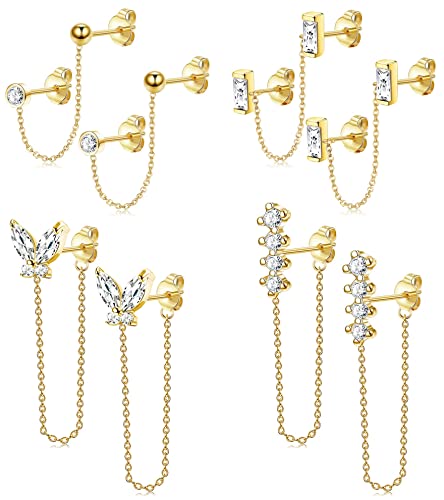CASSIECA 4 Paia Orecchini Bottone con Catena Rotonda Quadrata CZ Set Orecchini Goccia con Catena Farfalla per Donne Orecchini Bottone con Catena Ciondola per Piercing Doppio Foro Placcato Oro