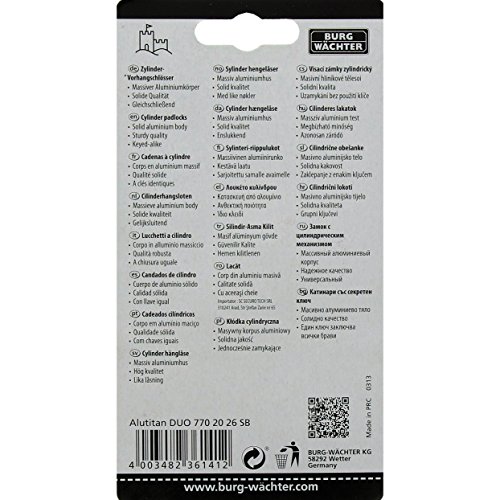 Contenuto della confezione: 1 set di 2 lucchetti Burg-Wächter, Duo 770 20 26 SB, con 4 chiavi, spessore stanghette: 3,5 mm, larghezza stanghetta: 11 mm, altezza staffa: 23 mm, altezza totale: 50 mm