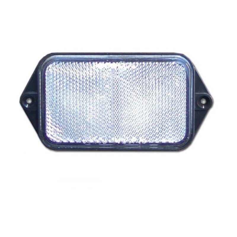 Catadiottro rettangolare bianco con bordo nero. Dimensioni 95x60mm. Viti non comprese.