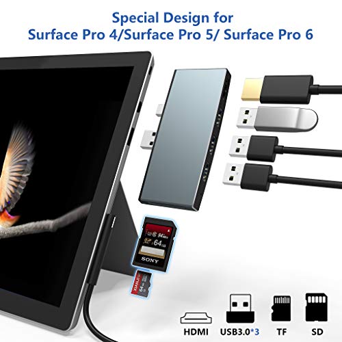 【6 in-1 Surface Pro Hub USB】USB hub speciale design per Surface pro 6 / pro 5 / pro 4, con hub USB multiporta con 3 porte USB 3.0, una porta HDMI 4K a 30Hz, uno slot per schede SD e uno slot Micro SD / TF. È anche un lettore di schede SD / TF e ti consente di collegare una tastiera, un mouse, un driver USB, un disco esterno a Surface Pro.